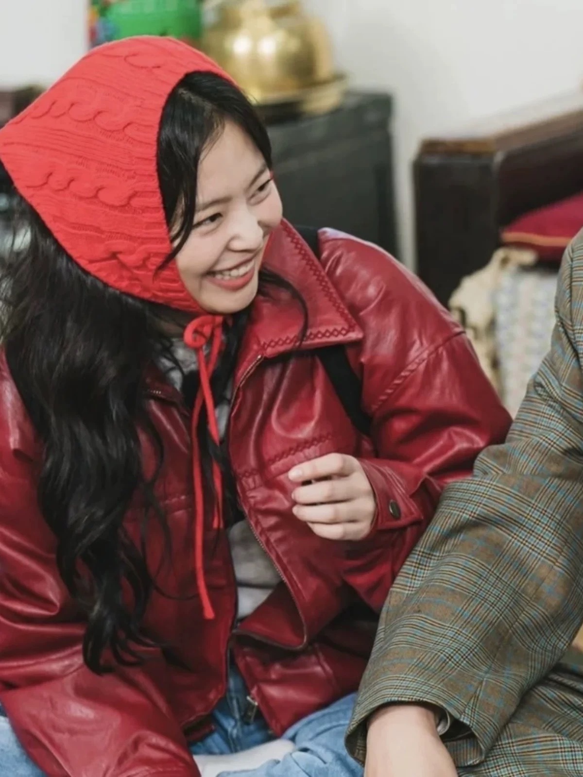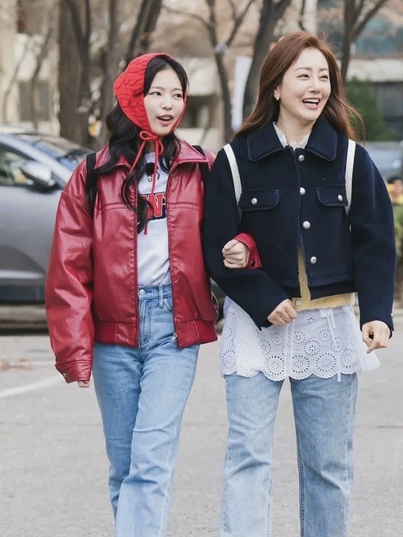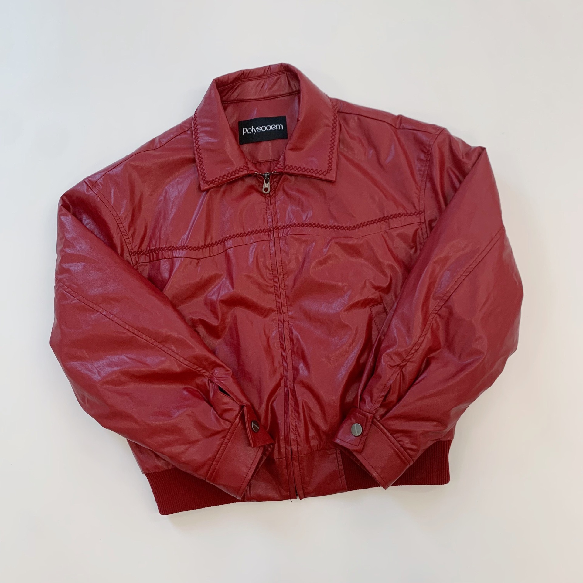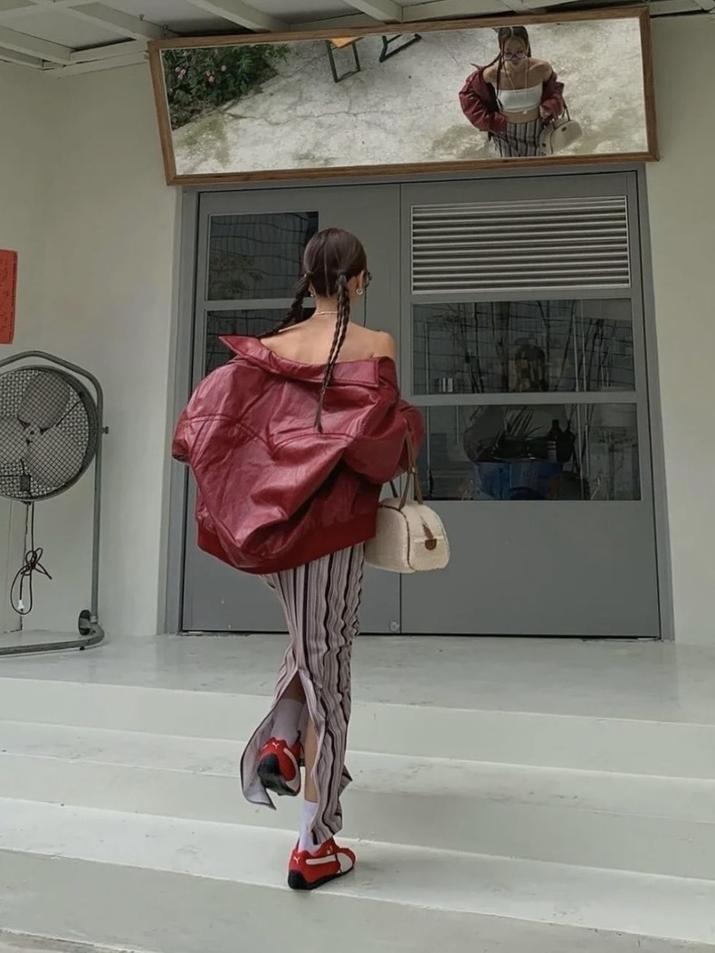 Polysooem Jennie穿過暗紅皮衣夾克